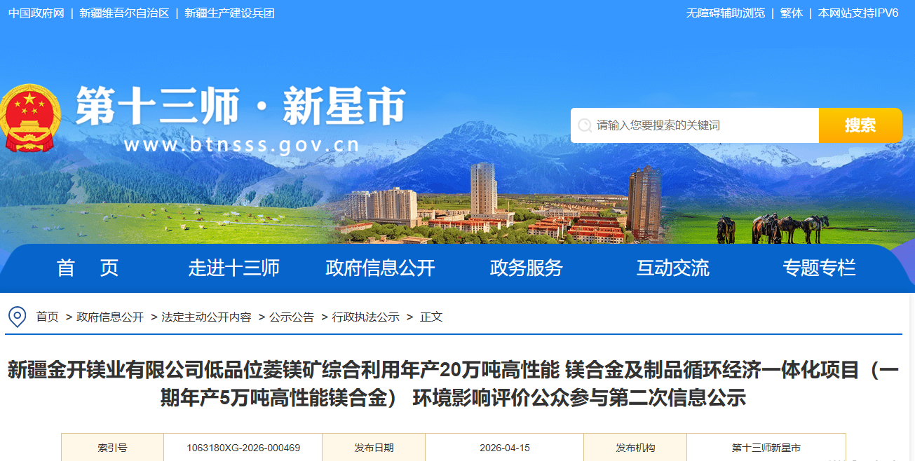 我公司委托新疆辰光啟航環(huán)保技術(shù)有限公司承擔(dān)了“新疆金開(kāi)鎂業(yè)有限公司低品位菱鎂礦綜合利用年產(chǎn)20萬(wàn)噸高性能鎂合金及制品循環(huán)經(jīng)濟(jì)一體化項(xiàng)目(一期年產(chǎn)5萬(wàn)噸高性能鎂合金)”的環(huán)境影響評(píng)價(jià)工作。現(xiàn)環(huán)境影響評(píng)價(jià)單位編制完成了《新疆金開(kāi)鎂業(yè)有限公司低品位菱鎂礦綜合利用年產(chǎn)20萬(wàn)噸高性能鎂合金及制品循環(huán)經(jīng)濟(jì)一體化項(xiàng)目(一期年產(chǎn)5萬(wàn)噸高性能鎂合金)環(huán)境影響報(bào)告書(shū)》(征求意見(jiàn)稿),根據(jù)《中華人民共和國(guó)環(huán)境影響評(píng)價(jià)法》《環(huán)境影響評(píng)價(jià)公眾參與辦法》(生態(tài)環(huán)境部令第4號(hào))等法律法規(guī)及相關(guān)規(guī)定,現(xiàn)對(duì)該項(xiàng)目進(jìn)行公眾參與第二次信息公開(kāi),請(qǐng)社會(huì)公眾對(duì)該報(bào)告提出意見(jiàn)和建議。公示材料如下: